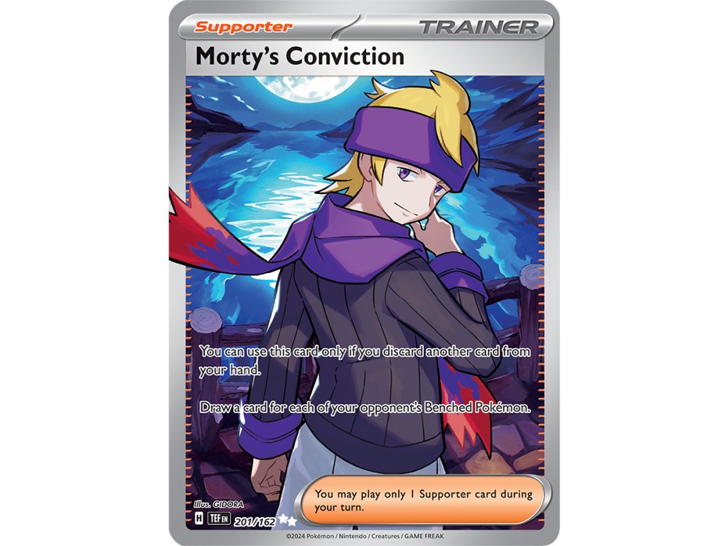 Pokémon Karta Morty's Conviction (TEF 201/162) z edice Scarlet & Violet: Temporal Forces.